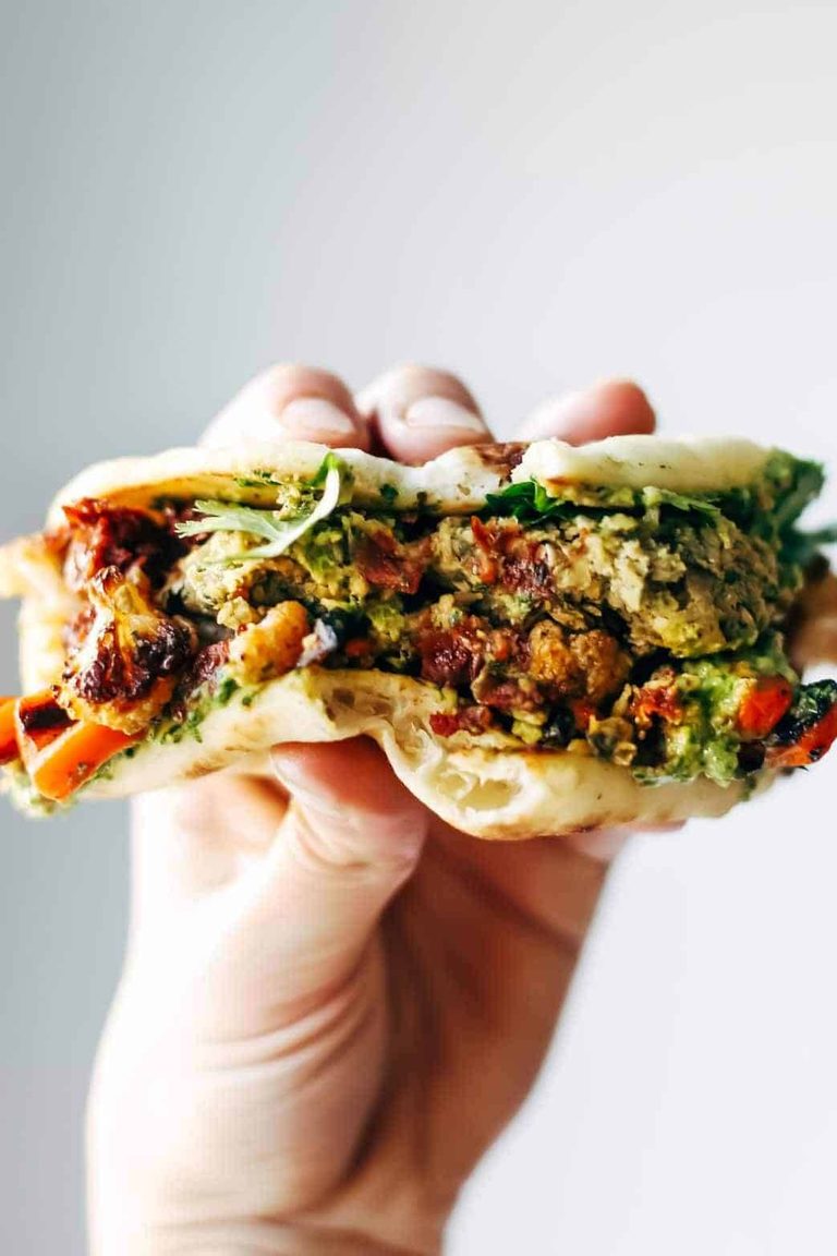 Naan-wich: 5 ingredient falafel, roasted veggies, and avocado sauce stuffed between pillowy garlic naan. Best sandwich recipe I’ve ever made.