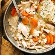 Source Notes: This recipe was inspired by a French bean and chicken stew in the book Jamie Oliver’s Food Escapes (affiliate link) – reading his description about making this in the French countryside sent me straight into the kitchen with a glass of wine and a big soup pot to channel all the country chicken stew vibes. Jamie’s recipe uses the bean soak method which I was unsure about at first, but it really does make the texture of the soup and broth so awesome. According to his notes, you can sub chicken thighs for the whole chicken, but this is a really great (read: easy) gateway into cooking a whole chicken if that’s something that you’re looking to add to your repertoire (not to mention getting some life-changingly delicious broth out of the deal).